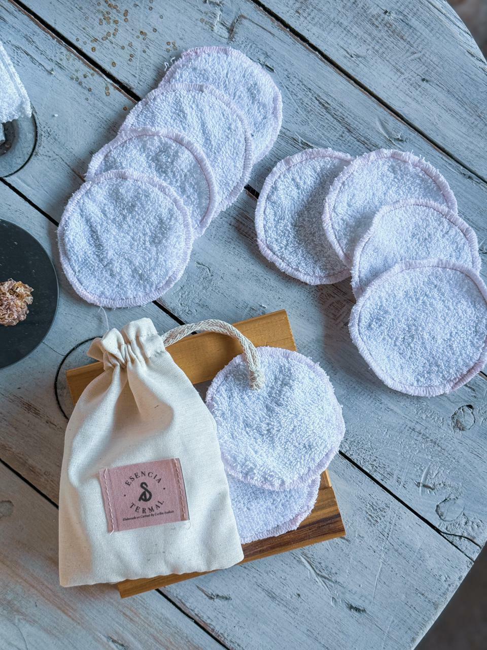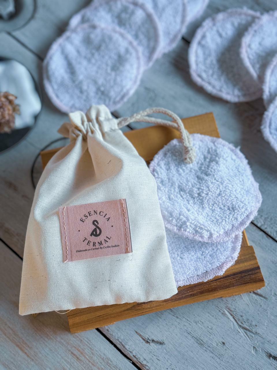 Pads x2 de toalla para limpiar y desmaquillar el rostro. Son lavables y reutilizables. Vienen en una bolsita de lienzo para guardarlos.